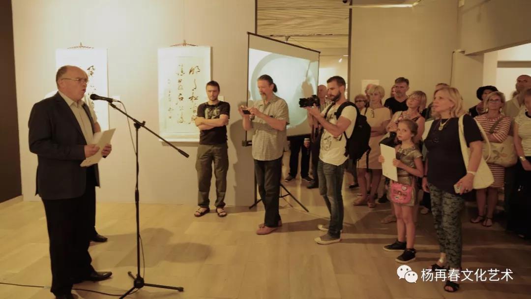 開幕式上司馬安教授和市長分別發表了演講,感謝楊再春先生作為克中文化交流的使者將傳統的中國書法文化帶到里耶卡,讓克羅地亞人民可以從書法藝術中感受到中國的文化力量。隨后楊再春先生向大家講述了展覽的主要內容,并現場進行書法表演。在場的外國觀眾對展出的作品和現場的表演都表現出了極大的興趣,反響熱烈。司馬安教授代表克中友好協會向楊先生贈送了刻有古老的格拉哥里語(Glagolitic script)的印章作為禮物。