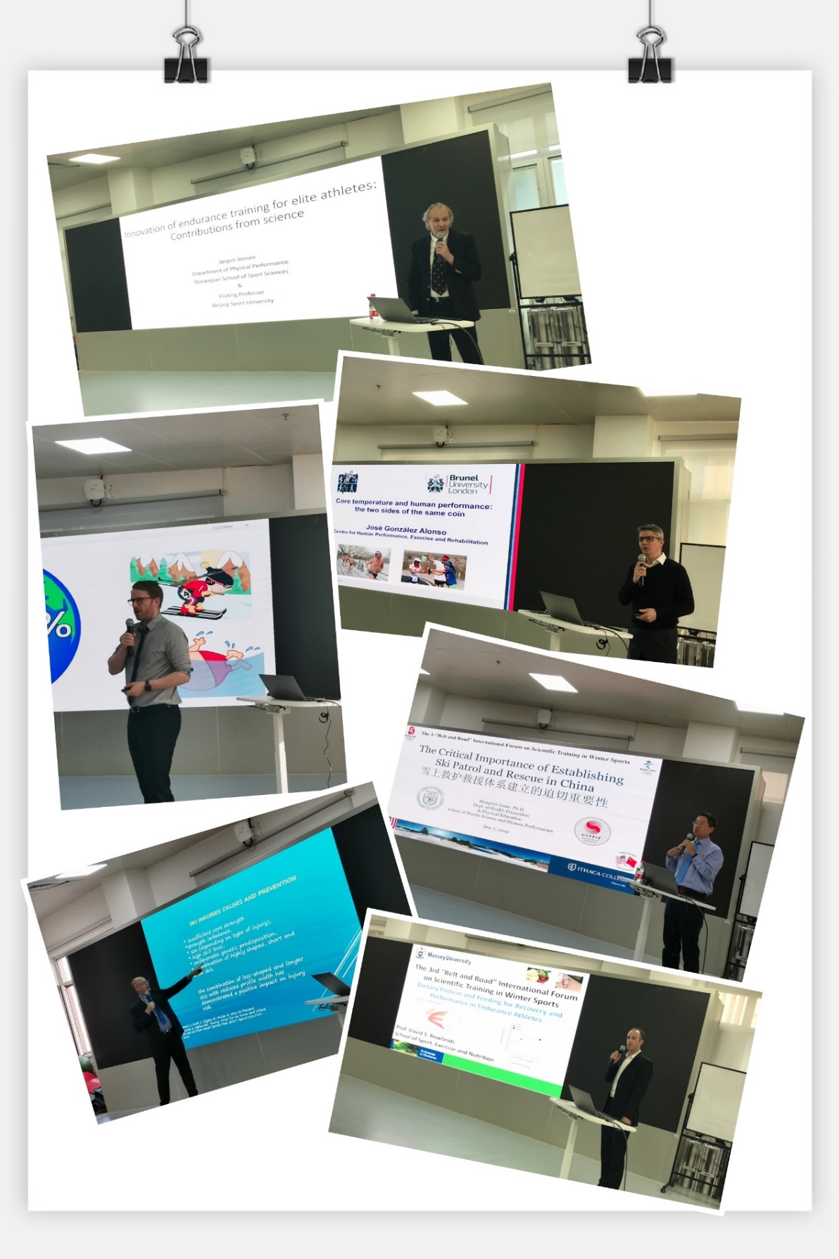 論壇報告環節,6名外國專家和2名我校專家分別對自己的研究領域進行了報告。來自挪威體育學院的Jorgen Jensen 教授主要從耐力訓練的分子適應和優秀耐力運動員的基因變異兩方面進行了闡述;來自英國布魯內爾大學的Jose Gonzalez Alonso教授主要從機體對高溫和低溫環境中運動的應激反應以及核心溫度的變化來探討溫度對人類運動表現的影響;來自丹麥哥本哈根大學的Morten Hostrup博士介紹了優秀運動員的呼吸并發癥和抗哮喘手段;來自意大利博洛尼亞大學的Antonio Cicchella教授對滑雪生物力學和運動損傷的原因與預防進行了詳細闡述;來自新西蘭梅西大學的David S.Rowland教授主要從蛋白質的補充方面來探討耐力運動員恢復和提高運動表現的合理營養與膳食;來自美國伊薩卡大學的關紅衛博士介紹了滑雪的危險性以及中國滑雪基地建立救援團隊的必要性。我校的劉卉教授和汪軍教授分別展示了近兩年在冬季項目方面的研究成果。