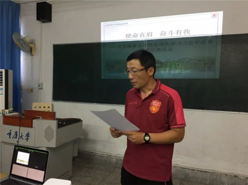 習近平總書記的回信在北京體育大學引起了強烈的反響,學校領導高度重視并積極組織全校師生對習近平總書記的回信進行認真學習,學校掀起了以“使命在肩 奮斗有我”為主題的習近平總書記精神的學習熱潮。正在山城重慶參加“2018-2019阿迪達斯全國青少年校園足球聯賽大學男子高水平組冠軍聯賽全國總決賽”的我校男足代表隊,在賽區硬件條件受限的情況下因地制宜,積極與賽事組委會進行溝通,在賽事主辦地重慶大學協調了一間多媒體教室,在領隊安建鋼、主教練任定猛的組織下,利用比賽間隙,集體對習近平總書記的回信進行了認真的學習。