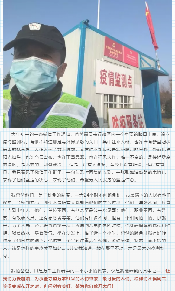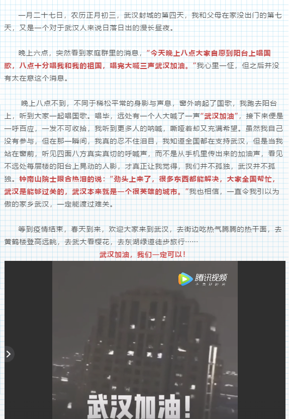 “同舟共濟 共克疫情”主題故事征集活動是北京體育大學學生會在疫情期間推出的特輯活動。當前,面對新型冠狀病毒感染肺炎疫情,全國上下正奮力抗擊。在這場防疫的戰場上,是無數在前線奮戰的醫護人員在奉獻與犧牲;是解放軍、志愿者緊急馳援;是普通民眾守望相助、傳遞愛心,人人都是參與者,人人皆為戰斗員。在這攻堅克難的特殊時刻,我們執筆記錄身邊的故事,記錄身邊正在發生的,在這場疫情防控戰中值得銘記的時刻,讓我們一起以文學的形式記述我們的時代精神。許多同學積極來稿,有身處武漢的同學講述身邊的暖心故事;有父母在戰疫一線的兒女分享父母的義無反顧;有同學分享自己的感動。