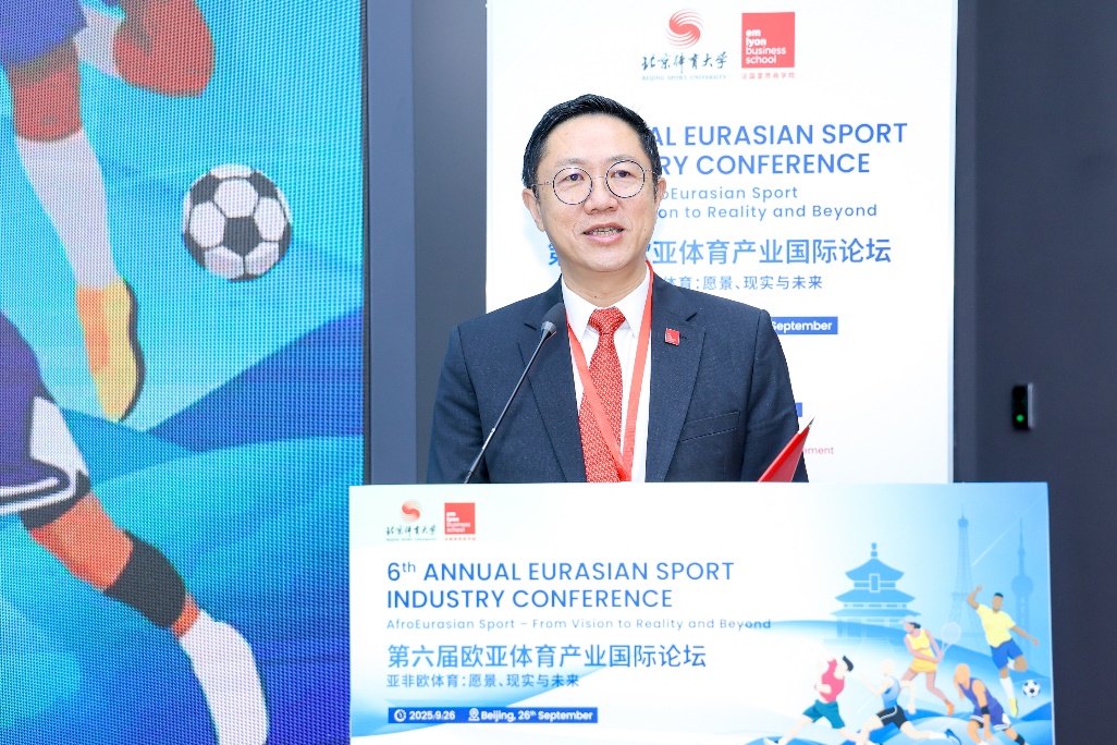 張劍校長(zhǎng)在致辭中向參加本次論壇的海內(nèi)外專家學(xué)者、業(yè)界同仁表示熱烈歡迎,向共同主辦單位法國(guó)里昂商學(xué)院表示感謝。他指出,體育是國(guó)際交往的重要紐帶,北京體育大學(xué)積極搭建高水平體育合作與人文交流平臺(tái),助力提升國(guó)家軟實(shí)力,深化區(qū)域互聯(lián)互通。歐亞體育產(chǎn)業(yè)國(guó)際論壇正在成為驅(qū)動(dòng)歐亞各國(guó)體育產(chǎn)業(yè)高質(zhì)量發(fā)展的重要?jiǎng)恿?。亞非歐大陸作為體育資源富集、創(chuàng)新活躍的核心區(qū)域,蘊(yùn)含豐富的體育生態(tài)。張劍校長(zhǎng)希望與會(huì)代表圍繞體育暢通跨文化對(duì)話,推動(dòng)建立更加包容的體育治理體系,并以賽事經(jīng)濟(jì)為抓手激活消費(fèi)新動(dòng)力等關(guān)鍵議題,推動(dòng)學(xué)術(shù)交流與產(chǎn)業(yè)實(shí)踐深度融合,積極推動(dòng)形成更加開(kāi)放、包容、可持續(xù)的區(qū)域體育合作新格局,為亞非歐體育產(chǎn)業(yè)高質(zhì)量發(fā)展和共同體建設(shè)貢獻(xiàn)智慧與力量。