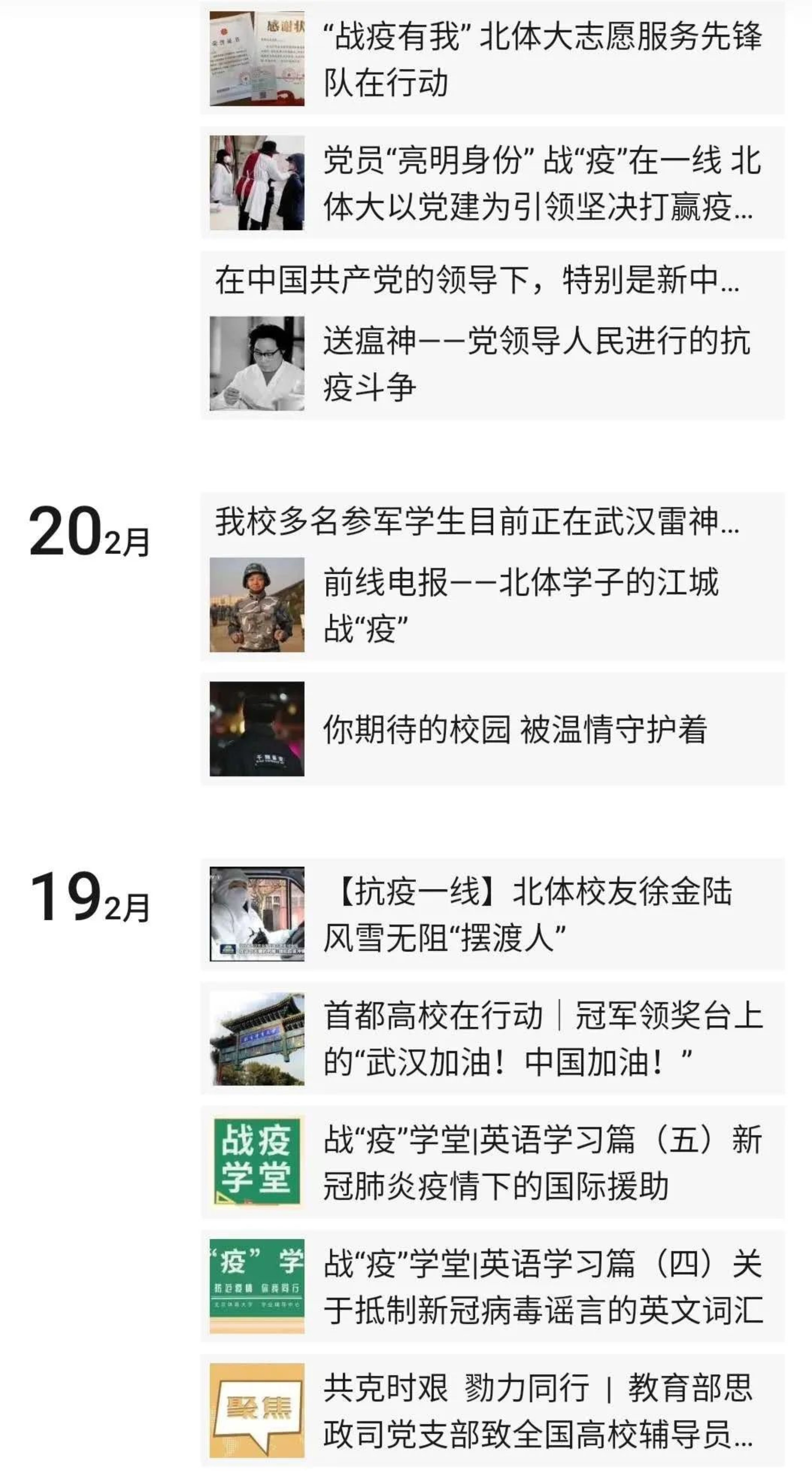 發(fā)布《共克時艱 風(fēng)雨同心——致北體學(xué)子的一封信》《眾志成城、共克時艱——致湖北籍北體學(xué)子的一封信》《致全體輔導(dǎo)員的一封信》等,將政策與要求轉(zhuǎn)化成言辭懇切的書信,引導(dǎo)全體學(xué)生響應(yīng)國家號召,遵守學(xué)校規(guī)定,樹立抗疫信心,增強(qiáng)社會責(zé)任感,在抗擊疫情的關(guān)鍵時期為北體學(xué)子注入一針強(qiáng)心劑。